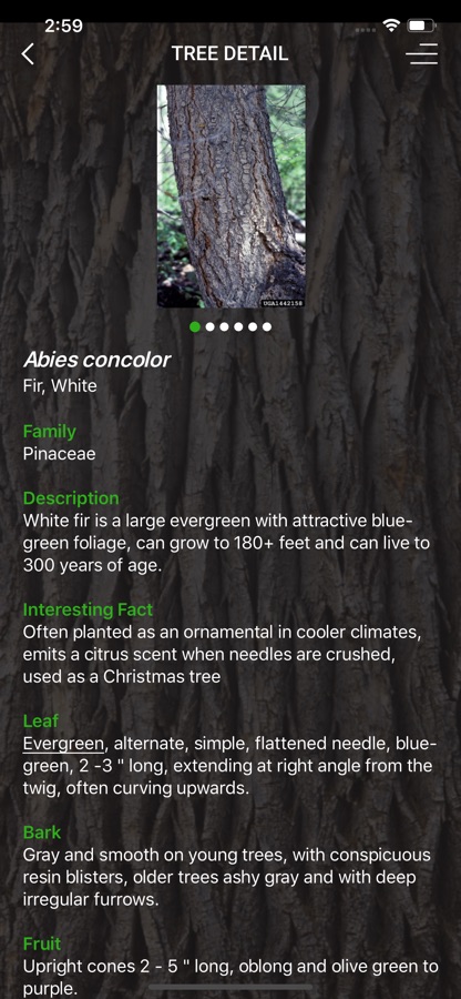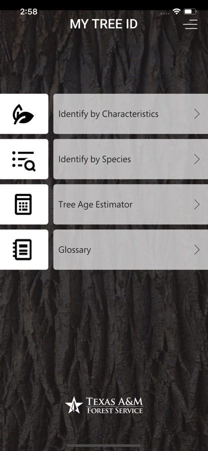 My Tree ID, developed by Texas A&M Forest Service, facilitates tree species identification based on leaves, flowers, seed, bark or location using a key, descriptions, and tree images. It contains over 1500 images from 475 different tree species and includes known occurrence maps from the Biota of North America Program for nearly all species. Individual tree detail pages have complete descriptions including interesting facts and similar species. The map feature allows users to input an address, select current location, or click on any point on the map to narrow the list. A full glossary and a tree age estimator tool complement the key and species list.