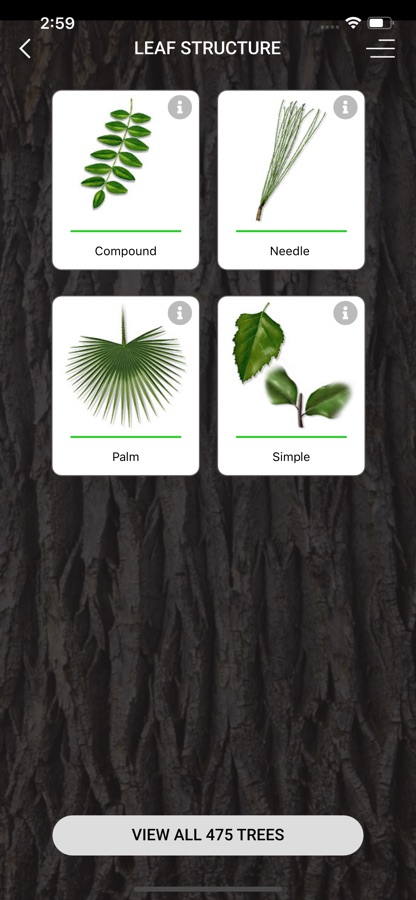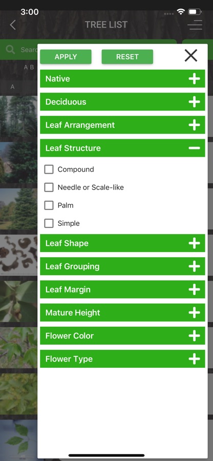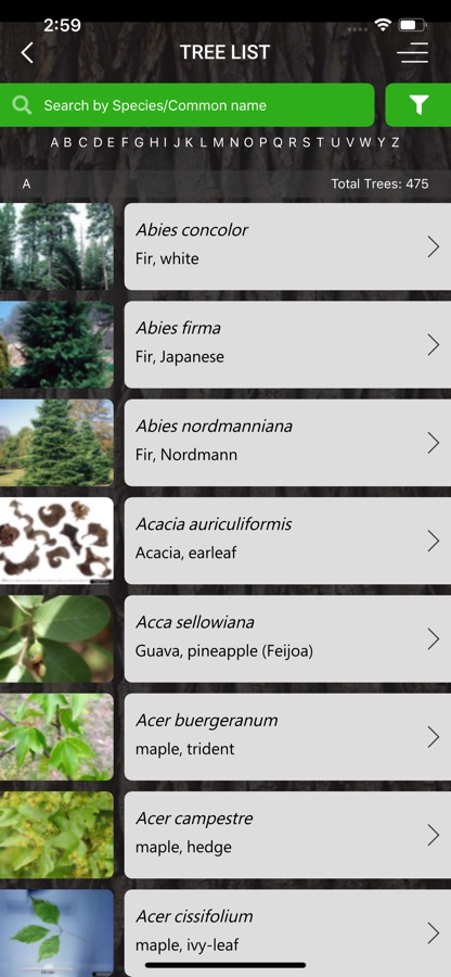 There are two ways to search for species. One, a simple key by characteristics directed approach, allows users to select one or more tree characteristics from large color icons. At any point in the process the possible species may be displayed. The other way is to select certain filters from the A-Z species list. The filter tool can also narrow down possible choices at any stage in the keying process. The species list is searchable by common or scientific name, or simply alphabetically.