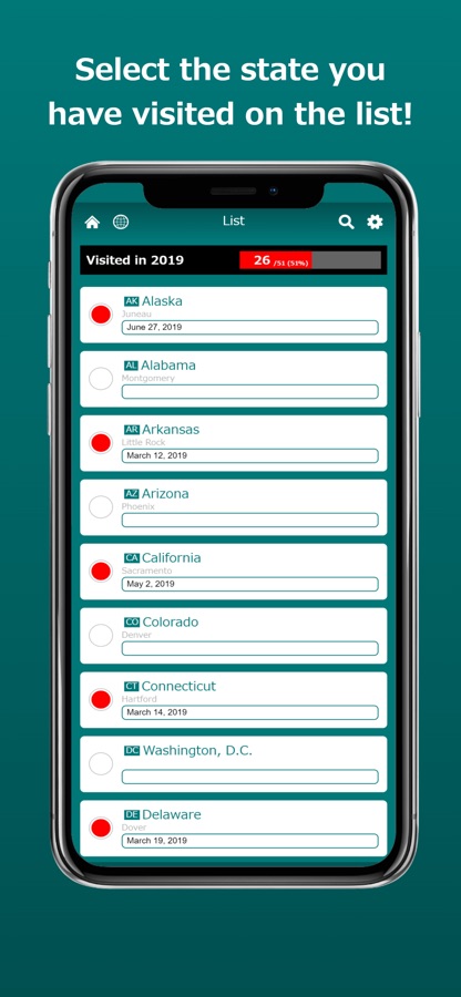 Это приложение показывает штаты, которые вы посетили на карте США! Отображая метки, вы можете легко найти состояния на карте. Карту можно увеличить или уменьшить.