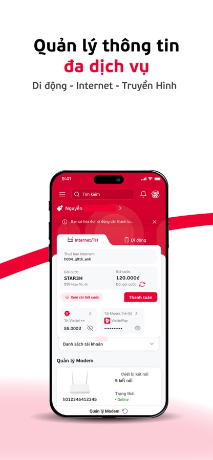Tra cứu chi tiết thông tin tài khoản, gói cước đang sử dụng: Di động, Internet, Truyền hình… Đăng ký gói cước Data, Thoại, SMS với nhiều lựa chọn và nhanh chóng chỉ với một chạm.
