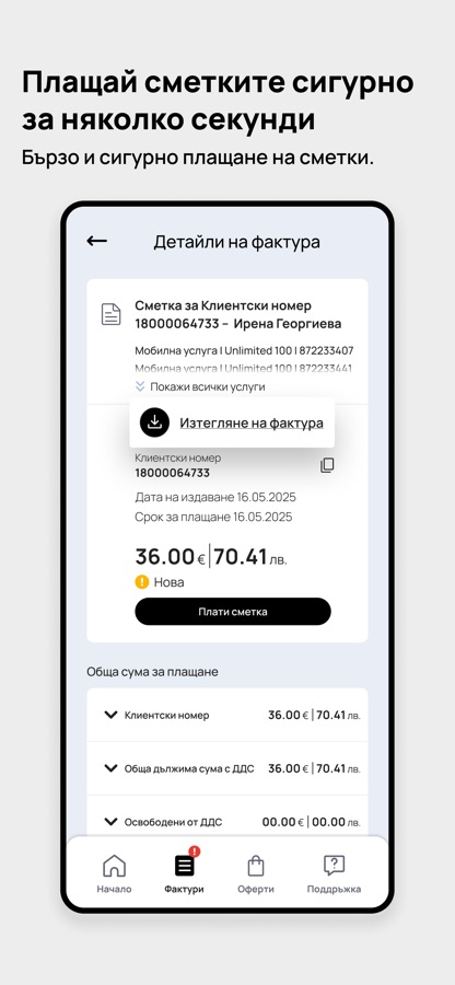→ Всичките услуги вече са подредени по договор и фактура – така лесно намирате това, което търсите. Виждате последната фактура веднага, с директен достъп до страницата за плащане.
