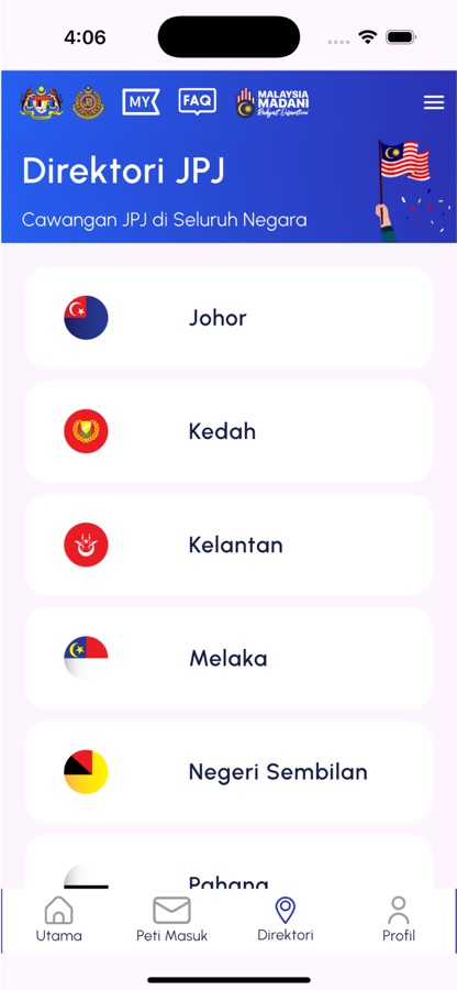 The MyJPJ mobile application is a gateway that brings together services for the public and JPJ staff. The public can check information related to JPJ services such as summons, Motor Vehicle License (LKM) expiry date, driver’s license expiry date, latest license plate number, and others. The public can also register a JPJeID and search for the location of the JPJ branch office. Additionally, there are quick links to other JPJ apps such as JPJeBid and JPJeQ. Logging in as JPJ Staff has additional modules and quick access to the eHadir application.
