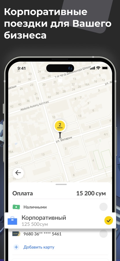 -Приложение поддерживает оплату наличными, картами Uzcard и Humo, Visa, Mastercard, а также через корпоративный счёт.