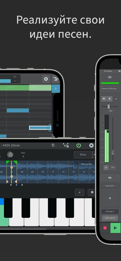 Записывайте любое количество аудио, MIDI и дорожек барабанов, микшируйте их при воспроизведении, добавляйте эффекты от Guitar Amps до VocalTune и Reverb. Редактируйте песни, делитесь ими онлайн и вступайте в сообщество Songtree, чтобы работать вместе.