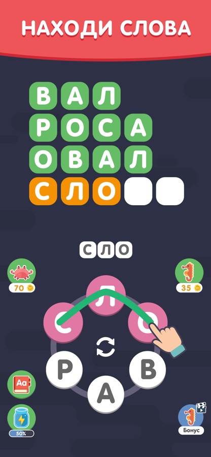 • Дополнительные монеты за каждое бонусное слово