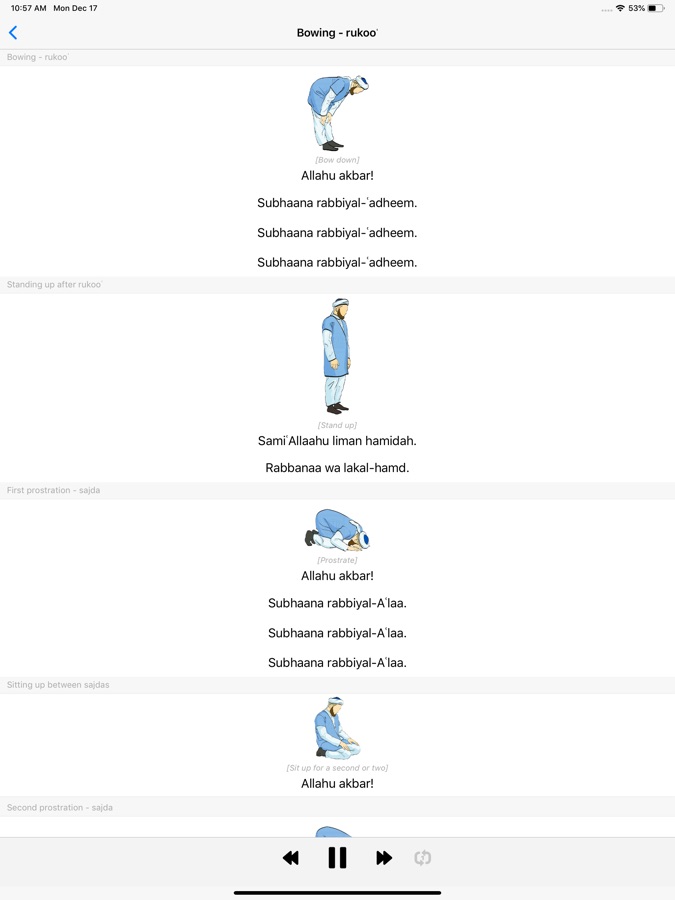 Наше приложение — это аудио плеер с правильным произношением текстов, которые читаются внутри намаза. Мы также включили сам текст молитв на кириллице (русском алфавите) и иллюстрации, чтобы облегчить понимание материала. Все тексты и позиции в намазе приведены в соответствии с правилами ханафитской школы права.