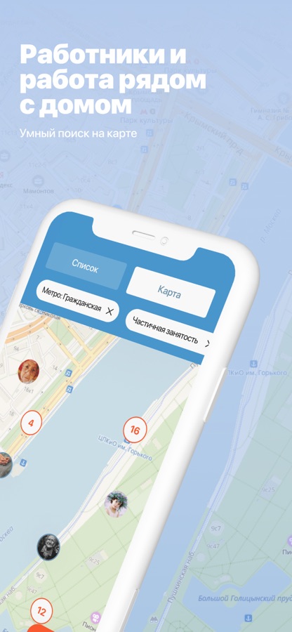 · Поиск по карте или по радиусу поиска от Вашего адреса или метро облегчит поиск персонала или работы рядом с домом.