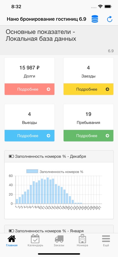 Основу приложения составляет календарь состояния номеров гостиницы (объектов). В календаре отображаются состояния номеров гостиницы по дням месяца. Для режима почасовой аренды существует отдельный календарь на один день с разбивкой по 5, 10, 15, 30 или 60 минут.