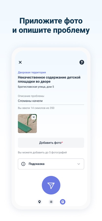 Во дворе вовремя не вывозят мусор? Не работает светофор? Заметили яму на дороге? Сообщите о проблеме, и она не останется без внимания!