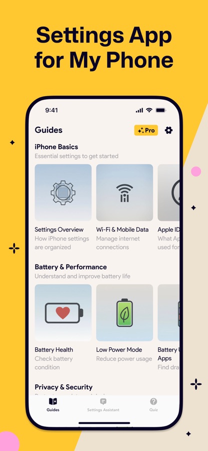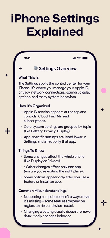 Узнайте, что делает каждый раздел приложения «Настройки» и как различные параметры влияют на ваше устройство. Приложение охватывает такие важные темы, как подключение, уведомления, использование батареи, конфиденциальность, безопасность и поведение системы, и все это объясняется простым языком.