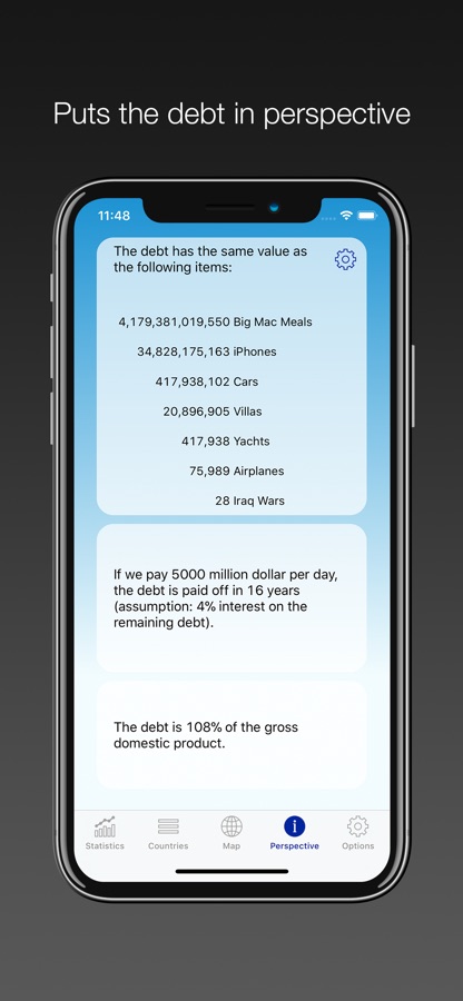 The app also shows how long it would take to pay off the debt when paying a given amount per day, and shows the debt as percentage of the gross national product.