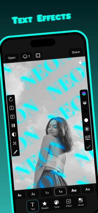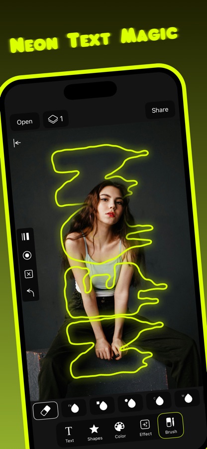 Используйте текст или фигуры как маски, точно стирайте нужные области или рисуйте собственные неоновые элементы кистью. Комбинируйте фильтры, текст и графику с помощью слоёв, создавая сложные композиции.