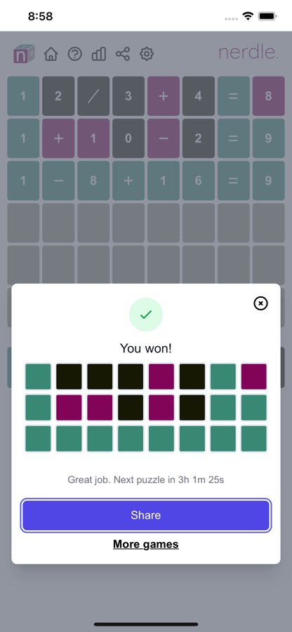Other games included: micro nerdle, mini nerdle, maxi nerdle, bi nerdle (two at once!), mini bi nerdle, instant, speed, crossnerdle (crosswords with numbers), shuffle and nanagrams. You can also replay previous games.