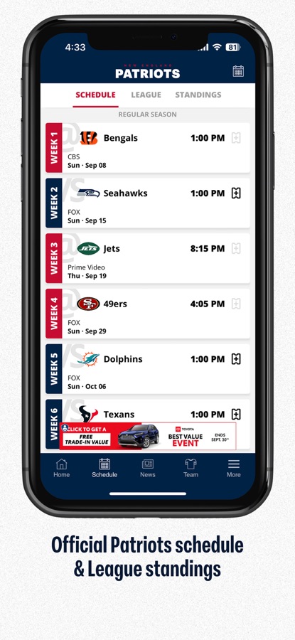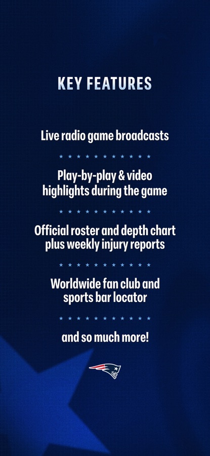The New England Patriots official app opens unlimited features and content for every Patriots fan: LIVE game commentary, play-by-play statistics, scores, game highlights, the latest team news and much, much more. Fans in New England can listen to the live 98.5 The Sports Hub radio game broadcast*. Plus, there’s instant access to the latest news, analysis, roster, and game schedule. Be the first to know about your team direct from Foxborough!