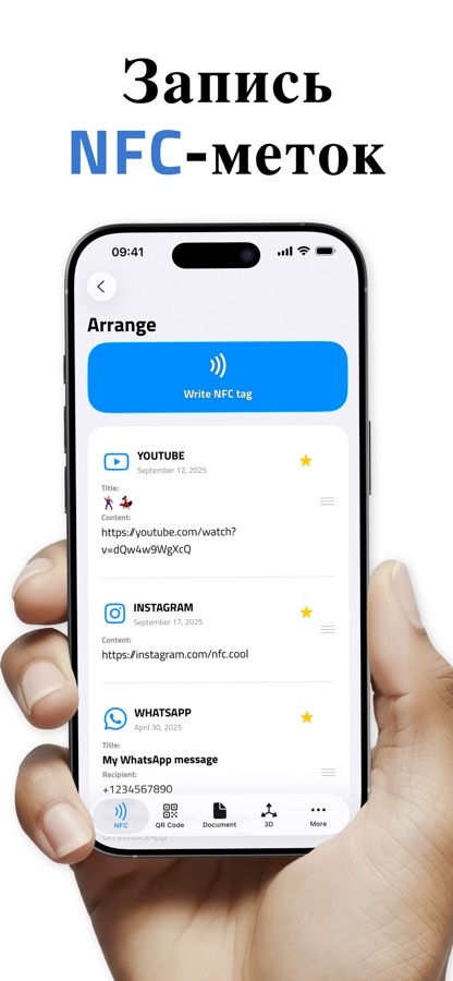 Считывай любые NFC-метки, чтобы увидеть веб-ссылки, учетные данные Wi-Fi, визитные карточки, номера телефонов, местоположение, ссылки на платежи, социальные профили и многое другое. Пиши собственные метки с сообщениями, которые открывают приложения, запускают ярлыки или напрямую подключаются к таким сервисам, как WhatsApp, Instagram, Spotify и платежным приложениям.