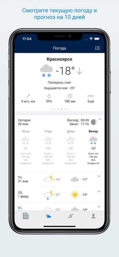 — смотреть текущую погоду и прогноз на ближайшие 10 дней;