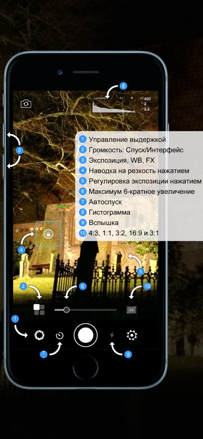 Только в этом приложении вы можете просматривать в режиме реального времени гистограммы освещенности, светосилы и сочетания цветов RGB, чтобы увидеть, в какие моменты имеет место переэкспонирование и недоэкспонирование.
