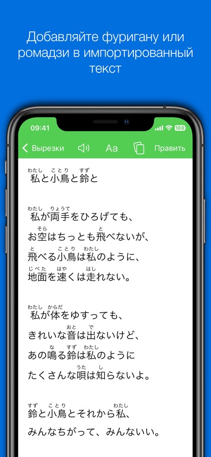 «Вырезки» – наш помощник в чтении – отличительная черта Nihongo по сравнению с другими словарями. Вставляйте текст на японском языке с веб-сайта, из электронной почты, электронной книги или любого другого источника, а мы добавим фуригану или ромадзи в каждое слово. Также можно нажать любое слово и просмотреть его определение. Это действительно изменит ваше восприятие японского языка. А теперь благодаря нашему специальному расширению у вас есть те же возможности прямо в Safari.