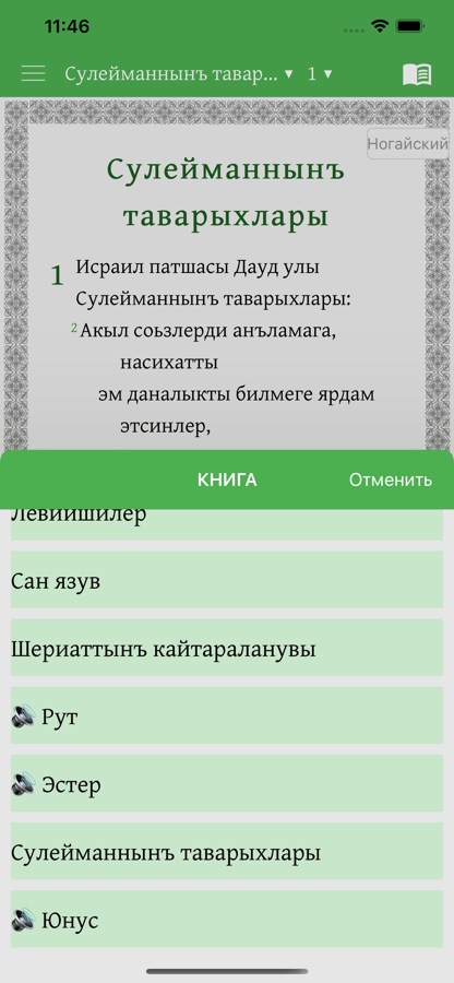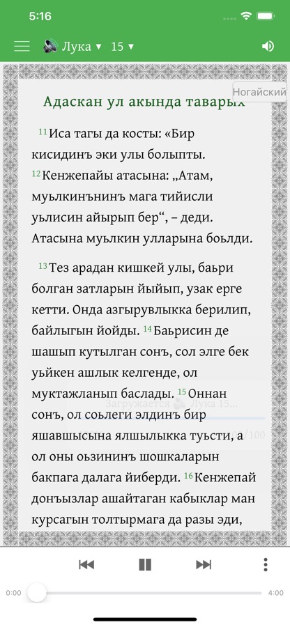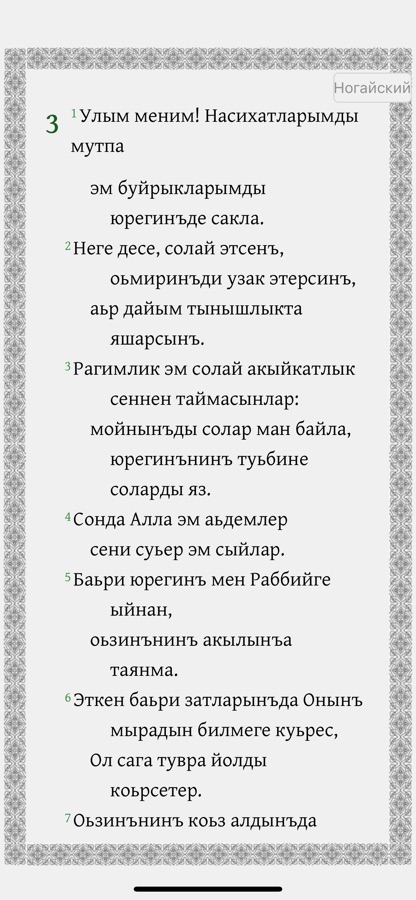 Это приложение предоставляет возможность изучения Священного Писания. Оно содержит как сам перевод на ногайский язык, так и русский перевод, который можно по желанию подключать параллельно. Пользователи могут выделять стихи разными цветами, размещать закладки, писать заметки, просматривать историю чтений.