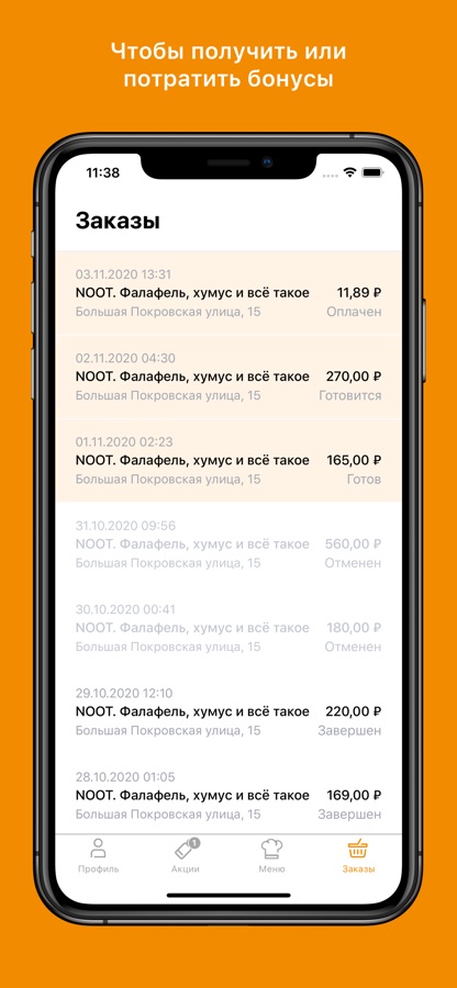 * Получать бонусы за каждый заказ и оплачивать ими фалафель, хумус и всё такое.
