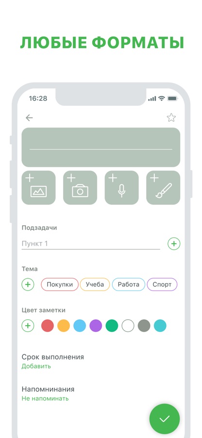 Заметка может состоять только из фотографии / картинки / аудио-сообщения / списка дел или покупок. Вы сможете использовать приложение даже за рулем или набегу – достаточно наговорить текст или сделать фото.