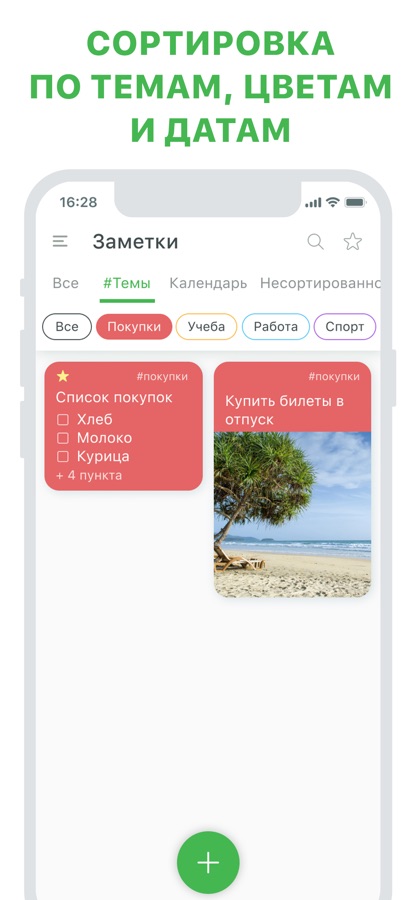 Заметки можно сортировать по важности, темам, дате выполнения, цветам. Это делает поиск по содержимому максимально быстрым и удобным.