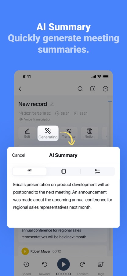 Start transcription with a single click on your device. Notta transcribes audio to text instantly, letting you focus on what matters most. The AI summarization feature extracts key points from meetings, lectures, and interviews — perfect for anyone using dictation or voice to text.