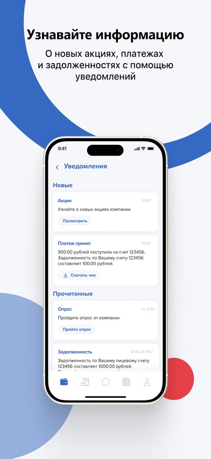 • Получать push-уведомления о начислениях, задолженности и новостях;