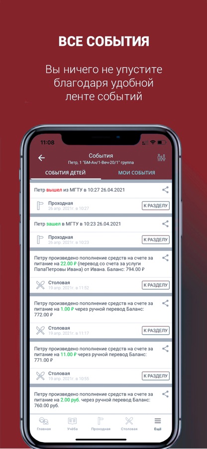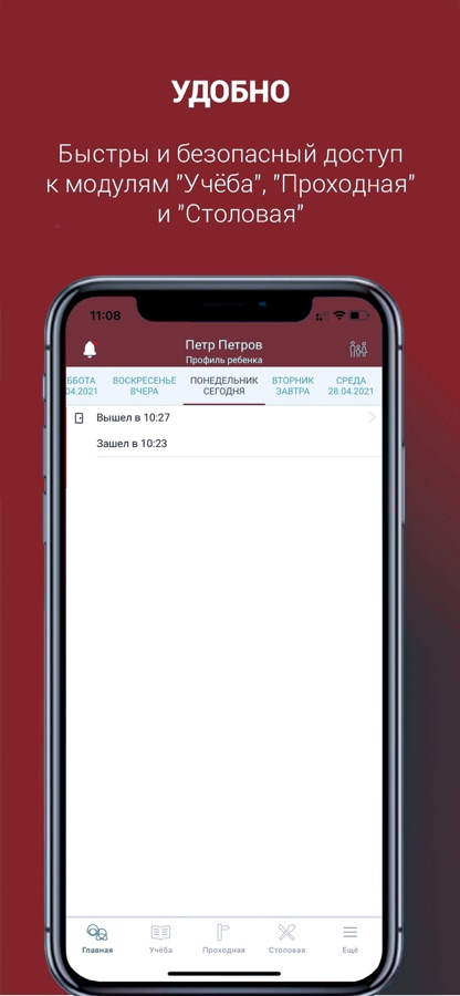 «Проходная» — отображает проходы пользователя через СКУД и даёт возможность представителям студентов отслеживать время посещения учебных корпусов и общежитий. Пользоваться паркингом университета и управлять собственными идентификаторами.