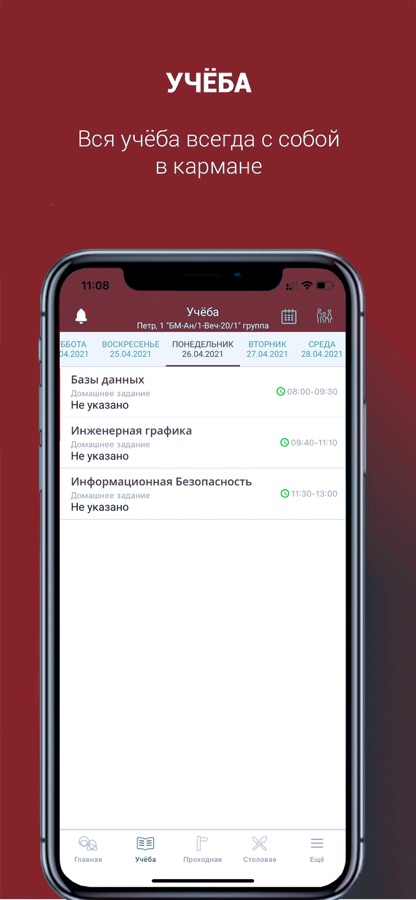 Приложение состоит из следующих модулей:«Учеба» — дает возможность просматривать информацию по учебной части: расписание и посещаемость занятий, расписание зачетов и экзаменов, учебные задания и учебный план.