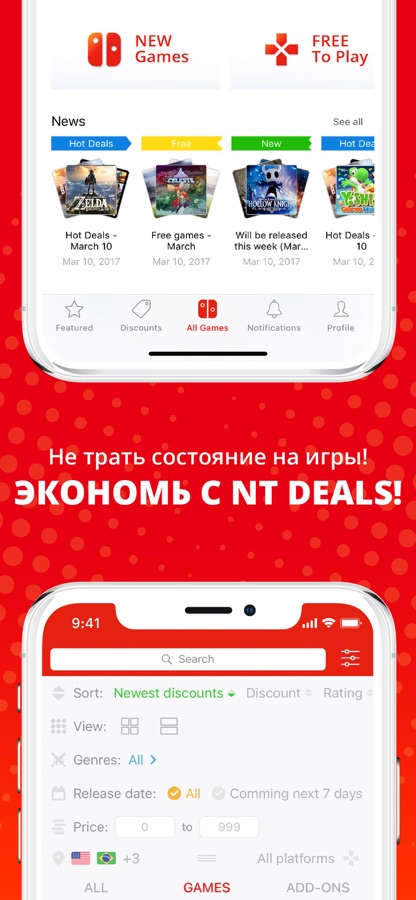 NT Deals — уникальный трекер цен на игры Nintendo в официальном магазине Nintendo eShop. С мгновенными уведомлениями об изменении цены! Отслеживайте цены, покупайте игры дешево или получайте бесплатно с NT Deals! И даже лучше — вся информация в одном месте: история цен, обзоры, видео, рейтинги, скриншоты, сравнение цен в разных регионах, что входит в покупку, читы, дополнения и многое другое!