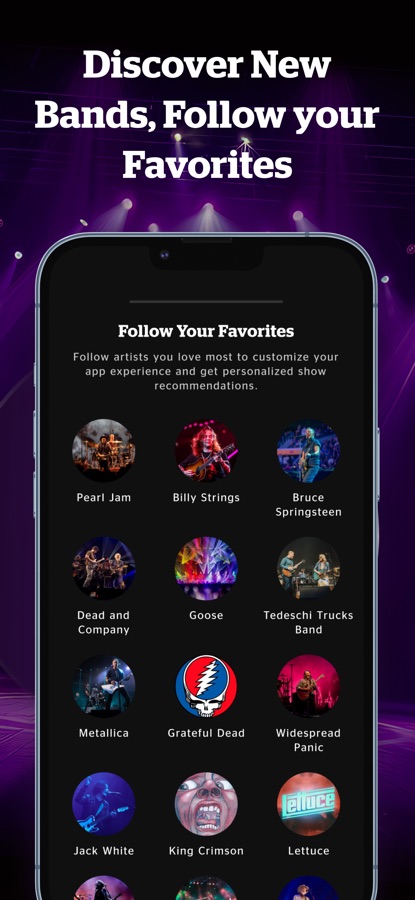 Pearl Jam — Bruce Springsteen — Billy Strings — Dead & Company — Metallica — Phish — Goose — Widespread Panic — Jack White — The White Stripes — Johnny Blue Skies — Tedeschi Trucks Band — The Allman Brothers Band — Grateful Dead — Jerry Garcia — Wilco — My Morning Jacket — The String Cheese Incident — The Disco Biscuits — Umphrey’s McGee — Pixies — Gov’t Mule — King Crimson — Peter Gabriel — Portugal. The Man — Blues Traveler — Counting Crows — Santana — and MANY MORE!