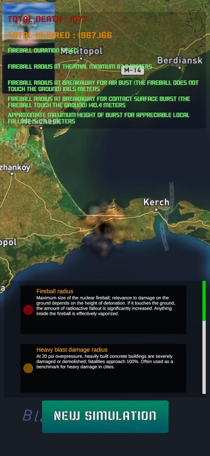 Кроме того, симуляция предоставляет статистические данные о катастрофических последствиях ядерного оружия в выбранном месте, включая степень разрушений и количество пострадавших.