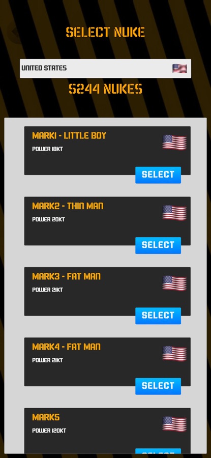 Выберите ядерное оружие из арсеналов различных стран, включая Соединенные Штаты, Российскую Федерацию, Китай, Соединенное Королевство, Францию, Индию, Пакистан, Израиль и Северную Корею, и визуализируйте его воздействие на 3D-карте. Симуляция точно отобразит мощность каждого ядерного оружия в килотоннах, а также дополнительную информацию, такую как количество и год производства.