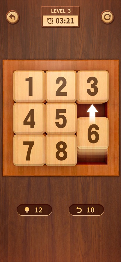Игра-головоломка с перемещением фигур представляет собой рамку с пронумерованными квадратными плитками. Они расположены в произвольном порядке, при этом отсутствует одна плитка. Цель головоломки — перемещать плитки и расставить их по порядку, используя пустое пространство. Бесконечный режим испытаний, который бросает вызов вашему логическому мышлению и ментальным ограничениям