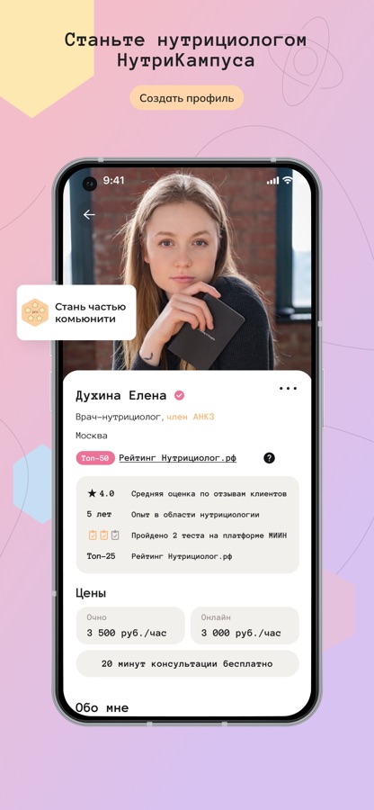 · Продвижение и повышение популярности профиля нутрициолога и возможность его размещения среди ТОПовых экспертов