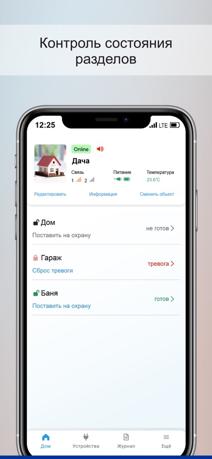 • Отображение состояния контрольной панели, уровня сети GSM, температуры внутри