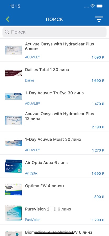 С помощью приложения возможно заказать любые линзы: прозрачные и цветные, торические и мультифокальные, различающиеся по сроку и режиму ношения, например: