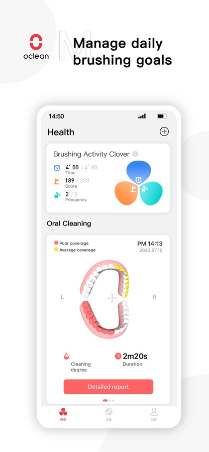 Powered by advanced artificial intelligence and digital technology, Oclean Care enables detailed analysis and tracking of every oral care session once you connect your Oclean digital toothbrush to the app. From brushing duration, frequency, and pressure to the cleanliness of each oral area, Oclean Care records and analyzes data comprehensively, providing you with scientific and accurate oral care insights.
