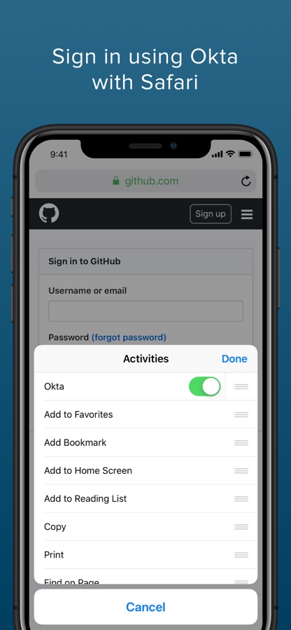 Okta Mobile provides single sign on to all the apps on your iPad or iPhone. As a companion application to the Okta Identity Management Service, you simply sign in with your Okta credentials and you’re immediately working in all of your company’s applications.