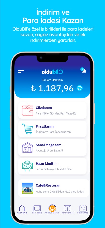 OlduBil ön ödemeli kartınla hem kendin hem de ailen için sayısız avantajdan ve indirimden faydalanabilirsin. OlduBil‘e özel iş birlikleri ile anında nakit iadesi alabilir, tüm hesap işlemlerini ve güncel bakiyeni uygulamandan takip edebilirsin.