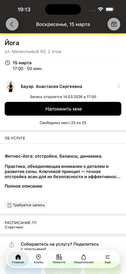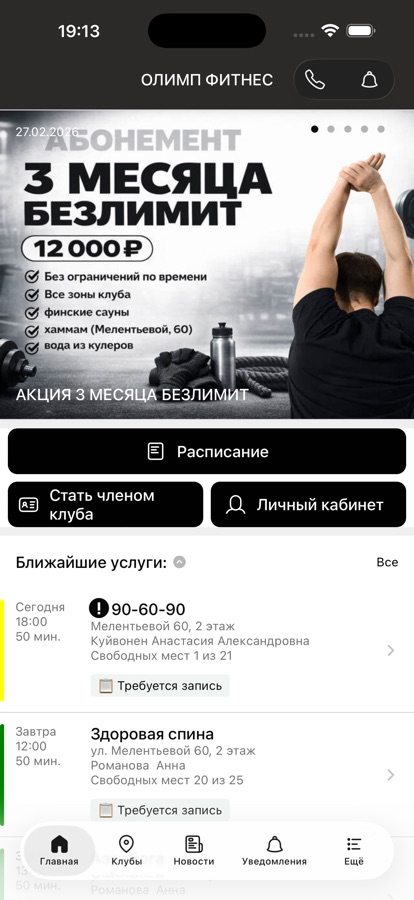 С помощью приложения вы можете следить за новостями, расписанием клуба, оперативно получать информацию об изменениях в расписании и специальных предложениях, а так же записаться на первое бесплатное занятие с тренером в тренажерный зал или групповое занятие.