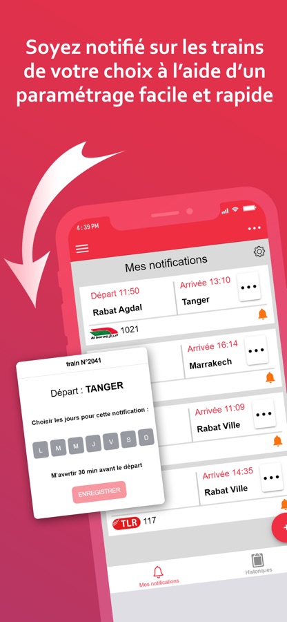 Grace à ONCF TRAFIC, vous pouvez consulter tous les détails de votre voyage : Gares desservies, Distance et temps de parcours de votre voyage, Numéro de voie, Emplacement de la 1ère classe.