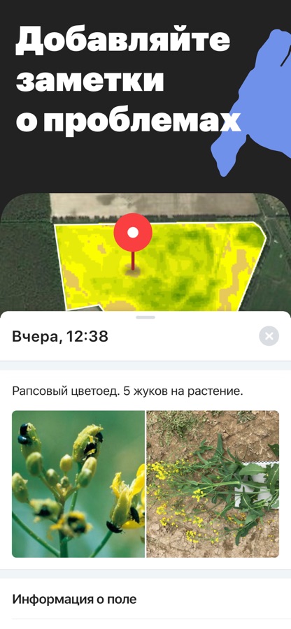 Оставляйте заметки во время осмотра полей, прикрепляйте к ним фотографии и делитесь их координатами с коллегами.