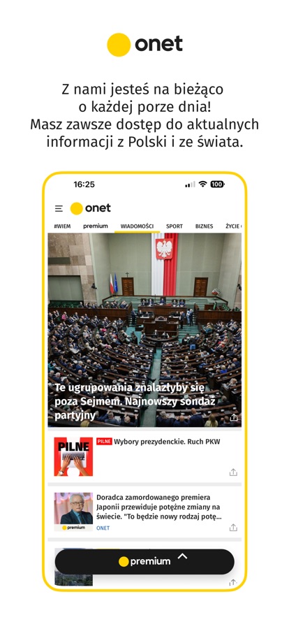 Z aplikacją Onet jesteś zawsze na bieżąco! Otrzymujesz najświeższe wiadomości z kraju i ze świata, sportowe emocje, informacje biznesowe, repertuar wydarzeń kulturalnych. A teraz także dostęp do ekskluzywnych treści w ramach pakietu Onet Premium.