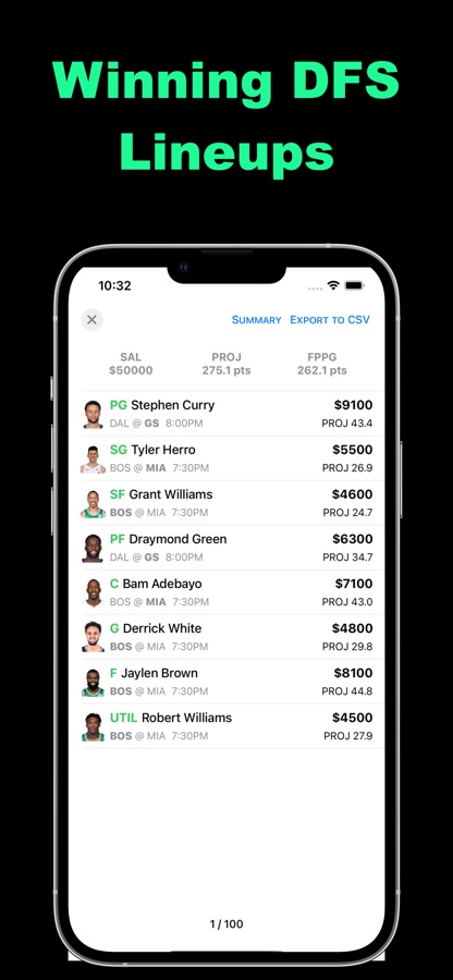 — Export your lineups to CSV and make uploading to DraftKings, FanDuel, and SuperDraft seamless.