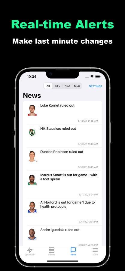 We provide real-time projections and injuries to build your lineups with confidence and send news updates via push notifications to allow you to make last-second decisions that will make or break your lineups.