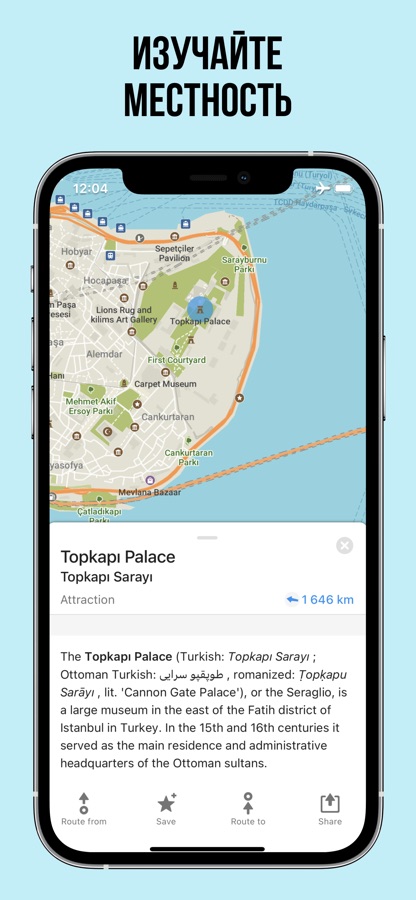 ИССЛЕДУЙТЕ МЕСТА: Ищите по адресу, названию места или категории, находите миллионы мест и просматривайте подробную информацию о них: часы работы, статьи из Википедии, доступность для инвалидных колясок и многое другое. Всё доступно офлайн.