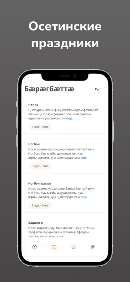 Описания к традиционным событиям составлены на двух языках – русском и осетинском. Для удобства пользователей они разделены по датам.