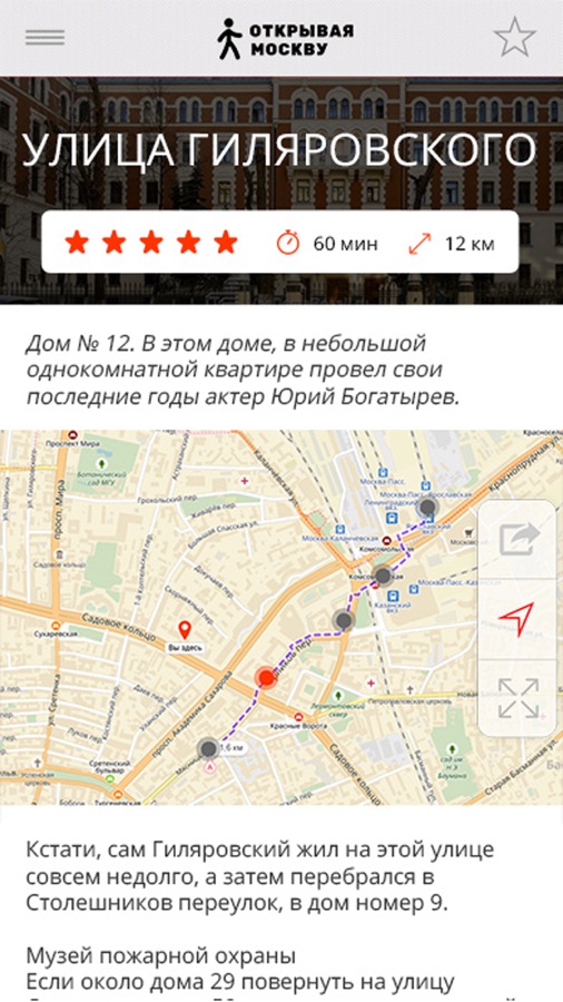 «Открывая Москву» это удивительное и удобное приложение для туристов и любителей пеших прогулок. С его помощью вы познакомитесь с красивейшими, интересными и историческими местами Москвы. Все прогулки в приложении разбиты на категории, места съемок фильмов, религиозные, активный отдых и т. д. Выбрав прогулку, вы увидите на карте маршрут и его ключевые точки с их описаниями и фотографиями. В разделе краеведение познакомитесь с интересными и историческими фактами и события связанными с объектами маршрута.